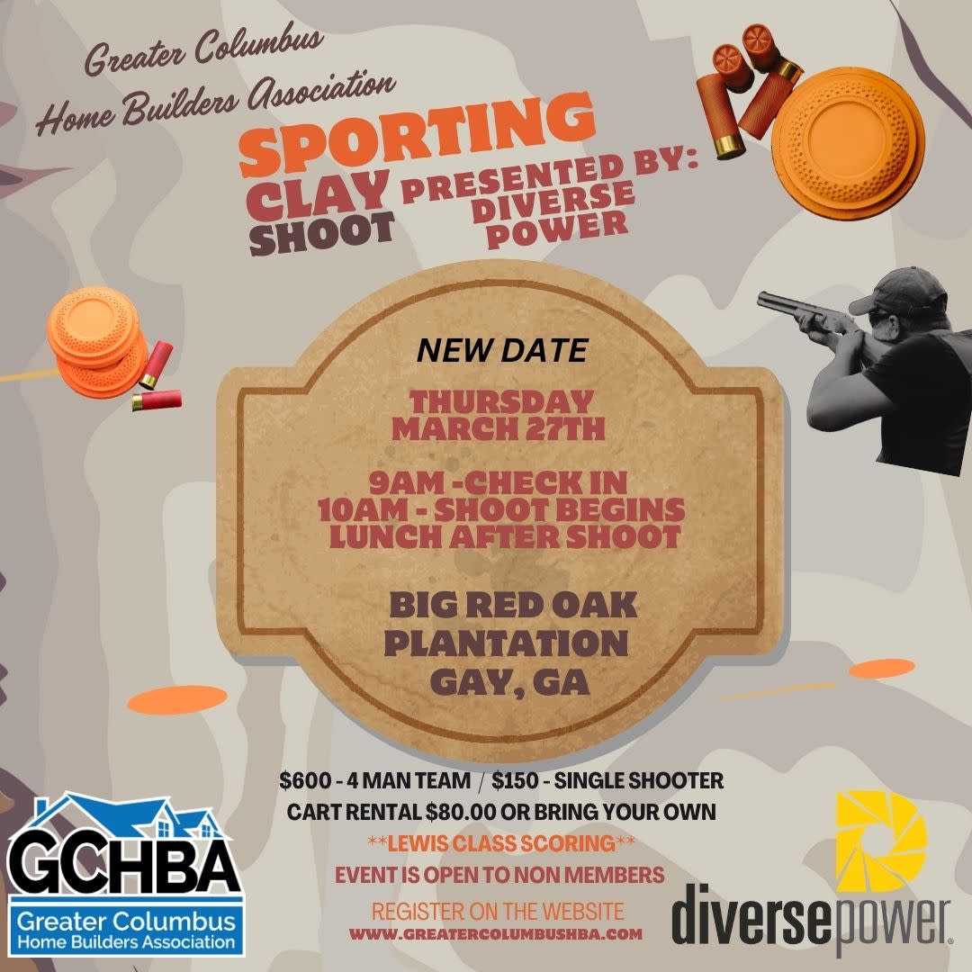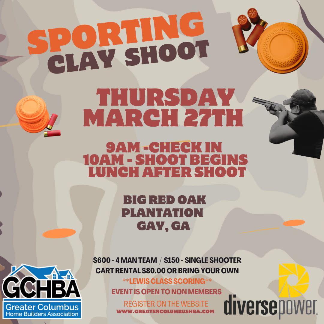 Join the Greater Columbus Home Builders Association Thursday, March 27th for our Annual Clay Shoot, hosted by Diverse Power, at Big Red Oak Plantation in Gay, Georgia. Registration begins at 9 AM, First Round begins at 10 AM Lunch will be provided directly after the shoot ends.